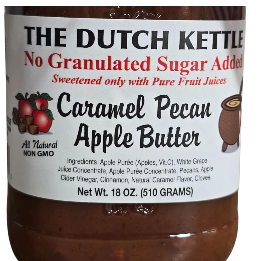 Indulge in the rich, homestyle taste of this Amish Caramel Pecan Apple Butter. These two18-ounce jars delivers a delightful blend of smooth apple butter enhanced with decadent caramel, cinnamon and nutty pecans. What makes this spread truly special is that it's sweetened naturally with pure fruit juices instead of granulated processed sugar, allowing the authentic flavors to shine through. Perfect for spreading on warm toast, mixing into yogurt, or using as a unique addition to your baking recipes. The all-natural ingredients create a wholesome spread that captures the essence of traditional Amish cooking methods while catering to modern dietary preferences. This versatile apple butter brings together the warmth of caramel, the crunch of pecans, and the comfort of apples in every spoonful.